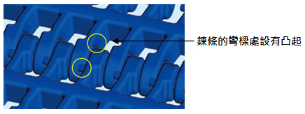 - 鏈條上表面採用特殊凹凸形狀,可起到防滑作用。採用該形狀,即使在鏈條上表面上作業(yè)也不易打滑、不易勾住。還可用於載客輸送機等