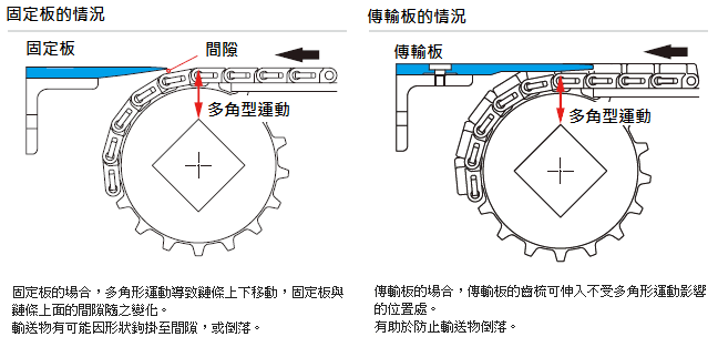 - 與傳輸板組合使用,梳齒型可以消除傳輸部分的階差,防止容器倒落,最適用於回溫機等